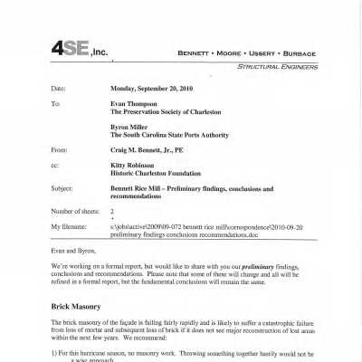 Folder 8: 2000s correspondence and other documentation regarding the stabilization and use of the Bennett Rice Mill site, including meeting packet for preservationists meeting on August 18, 2010. Includes report by 4SE Structural Engineers and supporting documentation (photos, drawings of existing/new bracing, copy of grant application.
