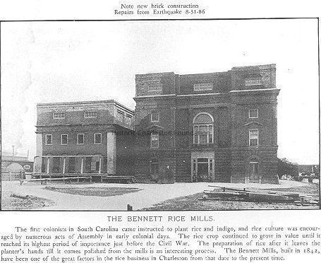 Constructed 1844; three walls of mill demolished 1960. Thomas Bennett, architect (?). One facade remains of a large brick mill designed in the Classical Revival style, possibly by its owner, Gov. Thomas Bennett. The structure contained steam-powered mill apparatus that separated rice grains from husks. The Bennett and Lucas families owned most of the six mills operating in the city by 1860, producing more than 470 barrels of rice daily, each containing 600 pounds. Operating from the time of construction until 1911, when a hurricane in that year virtually ended the lowcountry production of the crop, the building was part of a complex that included other buildings, water and rail access, and a mill pond. Bennett acquired the site by 1829, but the construction of this mill did not commence until 1844 and operation of the mill began in January of 1845. Beginning as a 90-by-60 foot building, the Bennett Mill was slightly smaller than Chisolm's Mill at 200 Tradd Street and substantially smaller than the West Point Mill, a Bennett-owned facility at 14 Lockwood Drive. A large wing was added in the mid-19th century. The mill continued under Bennett family ownership and was capably managed by Washington Bennett's foster son, Andrew Buist Murray. After closure the mill progressively deteriorated while national recognition of its architectural character increased. In 1952 the building was condemned, but both Historic Charleston Foundation and the Preservation Society worked toward its preservation, leasing the building for five years in 1958. Hurricane Donna in 1960 substantially weakened the deteriorated Bennett Mill. The city ordered the building demolished except for sixty feet of the west wall, which was saved by local preservationists as a reminder of the mill's industrial grandeur. (Poston, Buildings of Charleston.)