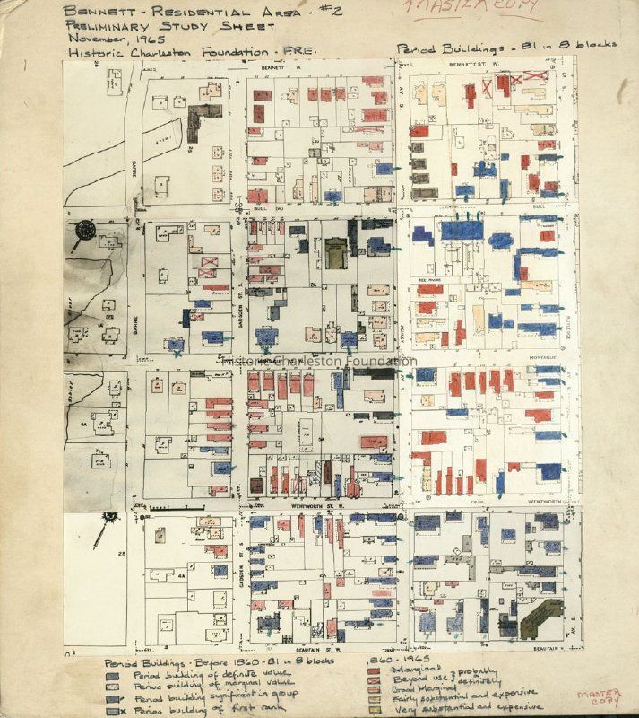 Copy of a Sanborn Map hand-colored and annotated for use by Historic Charleston Foundation to study the residential area in Harleston Village bounded by Bennett Street, Rutledge Avenue, Beaufain Street, and Barre Street.