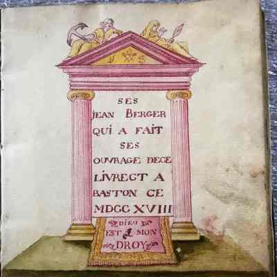 Written on frontispiece in ink: SES/JEAN BERGER/ QUI A FAIT/SES/OUVRAGE DECE/ LIVRECTA/ BASTON CE/ MDCCXVIII/ DIEU/ EST MOE/ DROY