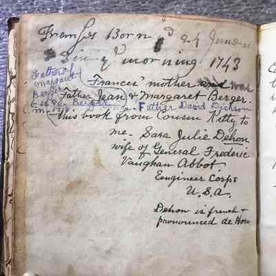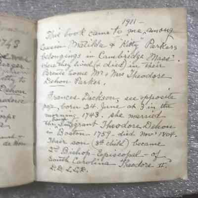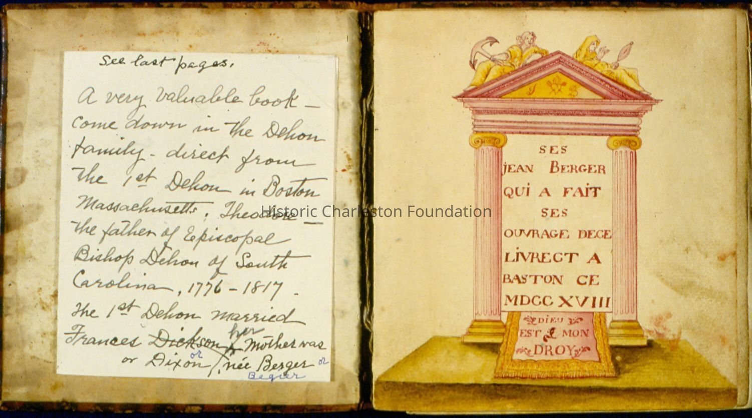 Berger included genealogical notes in his design book, and as the object descended in the Berger family, its owners augmented the information. Opposite Berger's own signature-page, the final descendant, who donated this rare document to Historic Charleston Foundation, recorded the intermarriage of the Berger and Dehon families in the nineteenth century. Theodore Dehon (1776-1817), bishop of South Carolina, married Sarah Russell, daughter of Nathaniel Russell, and the book then descended in the Russell-Dehon family.