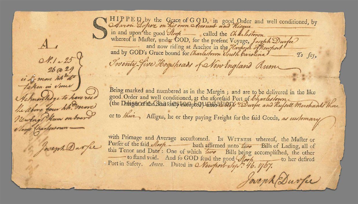 A bill of lading dated Sept 16, 1767 for twenty-five hogshead of New England rum imported by way of one Aaron Lopez and delivered to the Port of Charleston, SC for Durfee and Russell.