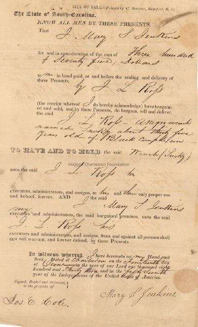 Digital facsimiles of a Bill of Sale of a "Negro wench named Lucky about thirty five years old of Black complexion," sold for $375.00 by Mary S. Jenkins to J.L. Ross, dated June 14, 1833. On verso is documentation of Lucky's transfer from J.L. Ross to James Legare on June 17, 1883.Collection