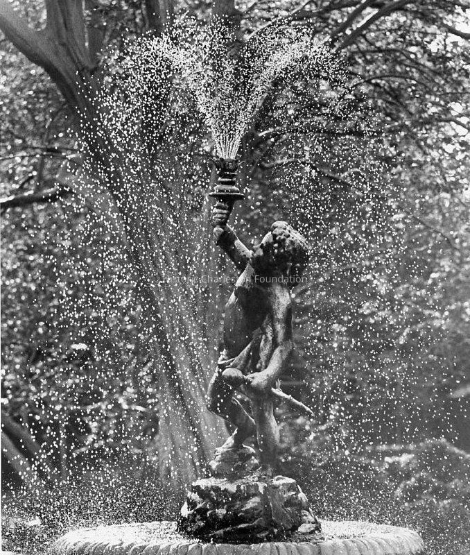 B&W photograph of the bird bath fountain at the James Ladson House (31 Meeting Street) taken in the summer of 1961.