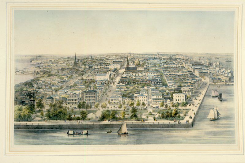This view of Charleston was published in 1851 by the Smith Brothers & Co. and forms a part of a series of large folio engravings and lithographs published between 1848 and 1856. In the tradition of Hill's other city vistas, this view of Charleston is taken from a slightly elevated viewpoint. Visible in the tinted lithograph are many of Charleston's most important historic residences and the churches, for which Charleston receives its attribution as the Holy City, including the First Presbyterian Church, St. Michael's Episcopal Church, Circular Church and St. Philip's Episcopal Church.