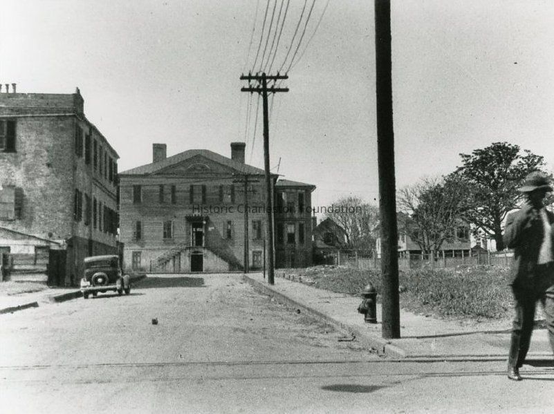 Reprint of an early 20th century photograph of the Blake-Grimke House (321 East Bay Street), front (east) elevation, viewed from the corner of Vernon and Washington Streets, a block away to its east. The north wing of the house is extant (added ca. 1850 and later removed during its restoration in the 1960s). The house to its north, 325 East Bay, is partially visible at right. The rear and north elevations of 332 East Bay Street, located across the street on the southeast corner of Vernon and East Bay, is at left with a car nearby parked on the street. The lot bounded on three of its sides by East Bay, Vernon, and Washington Streets appears to be vacant; this is likely the site of the Isaac Ball House, which was demolished in the 1920s. A man crosses Washington Street in the right foreground.Collection