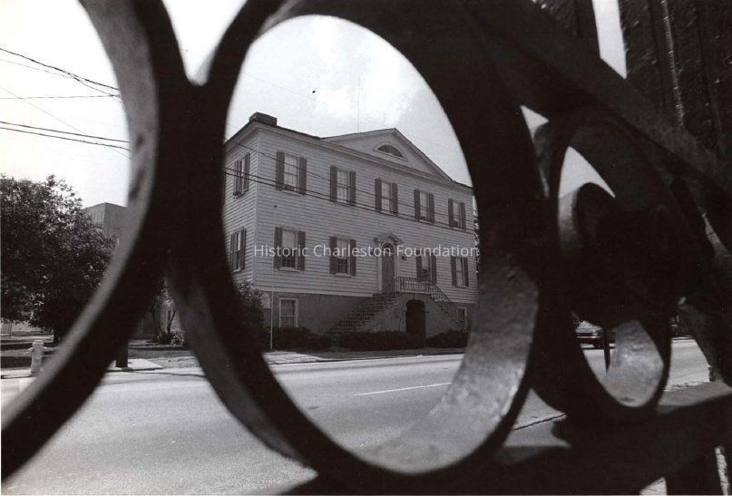 s: View of the east (front) of the building through an iron gate across the street.Collection