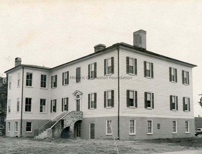 B&W photograph of the Blake-Grimke House (321 East Bay Street) after restoration by Historic Charleston Foundation. Features the south and west (rear) elevations with the piazzas having been removed.