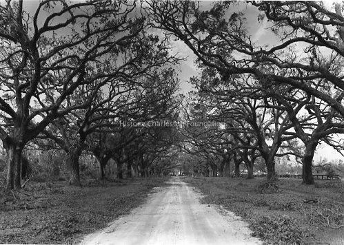 B&W photograph of the oak allee at Boone Hall Plantation after Hurricane Hugo.Collection