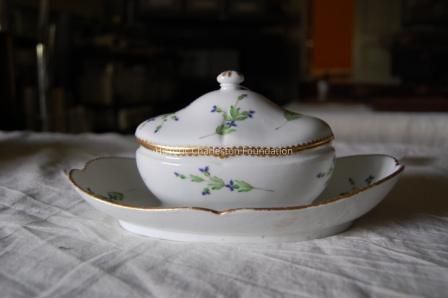 Comte d'Artois factory (ca.1771- ca.1796) Butter boat Limoges, France 1774/1796 Porcelain Marked: CP under a coronet in red enamel For information on the Comte d'Artois factory, see: http://www.musee-adriendubouche.fr/gb/pages/page_id18346_u1l2.htm (history of Limoges) Butter Boat with lid of Twenty Four Pieces of Bourbon Sprig Porcelain, French c.1790, marked CP under a coronet for Comte D'Artois Factory established in 1769, coming under the patronage of the Comte d'Artois in 1779.. . Hard Paste Porcelain in Bourbon Sprig Pattern with Gilt Edge. Descended in the Frost Family. Other Pieces Are English