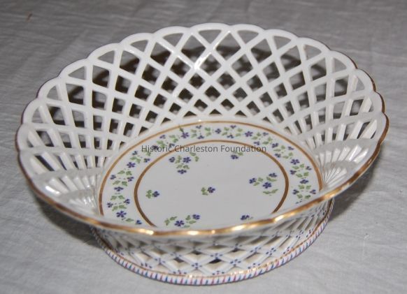 Notes: During the late 18th century, French porcelain became increasingly fashionable in America. for some, it was the close ties, cultural and political, that develped between America and France during the Revolution. For others, it was simply the new classical shapes with bright, decorative gilding that provided the attraction. The letters of Mary Stead Pinckney(d.1812), written in Paris during her husband's service as the United States ambassador, document the trend. In 1797, she described her visits with the other Charlestonians to the Parisian procelain factories:" Mrs. [Henry] Middleton, Ralph[ Stead Izard], Eliza [Izard], myself, and a genteman to conduct us went yesterday to visit the Angouleme manufactory of china...cups & saucers with beautiful miniature figures rivalling the first masters on ivory. vases from 50 to 1000 louis a pair--an absolute picture....we went to see the whole process, from the lump of clay which they were rolling about as if for a tart, til it took the form of the beautiful ware we had so much admired before... If I remain in France I shall certainly visit the manufactory of Seve,which is generally accounted superior to that of Angouleme." Mrs. Pinckney hoped to procure a set of fashionable china for her cousin, Margaret Izard Manigault. Sse informed her of recent ceramic purchases of other Americans in Paris, such as Mrs. Edward Rutledge and Mr. Codman of New York: " To the best of my judgment Mrs. E[dward] Rutledge's desert set is Angouleme, & the plates like hers at the manufactory are 6 louis each. Mr. King sent to Mr. Codman , a friend of his from Paris, & acquainted with business, & desired him to send him a table & desert set to cost 250 louis d'ors for the two sets, & to have them both alike, & nothing extraordinary-----a little bunch of purple flowers, & a gilt edge---a beautiful dessert set ( as I wrote Rebecca) only flowers of different colours. THis dessert service bears the mark of the Comte d' Artois factory. Established in 1769, this factory enjoyed the patronage of Charles Phiilippe, Comte d'Artois, the younger brother of Louis XVI and the future King Charles X of France. ( Charlestonians Abroad, Catalogue p.288) Status: OK Location Details1: 1