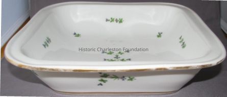 Part of Large Group of Bourbon Sprig Porcelain,Square Vegetable Dish with cover in Porcelain in Bourbon Sprig Pattern with Gilt Edge. Descended in the Frost Family. Cover has gilt trim with decorative patera knop handle trimmed in gilt, descended in the Frost Family, C.1830