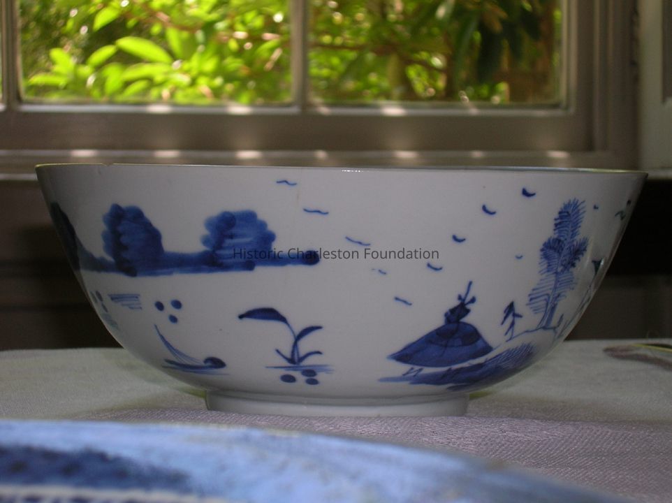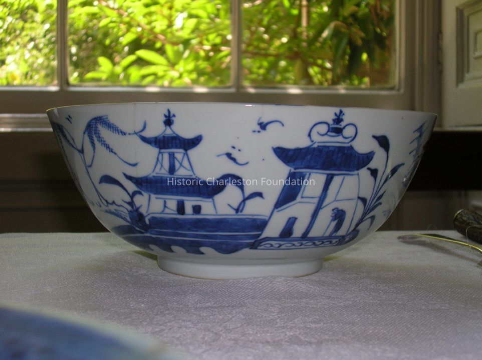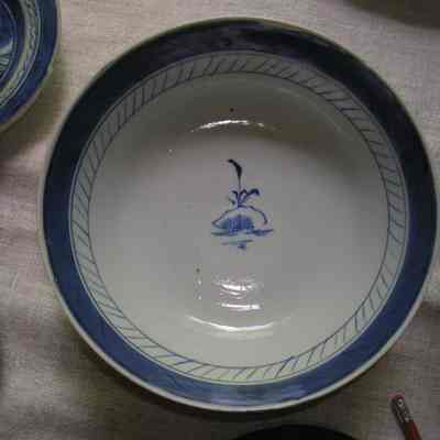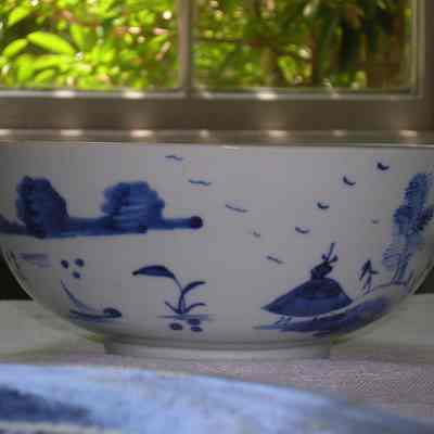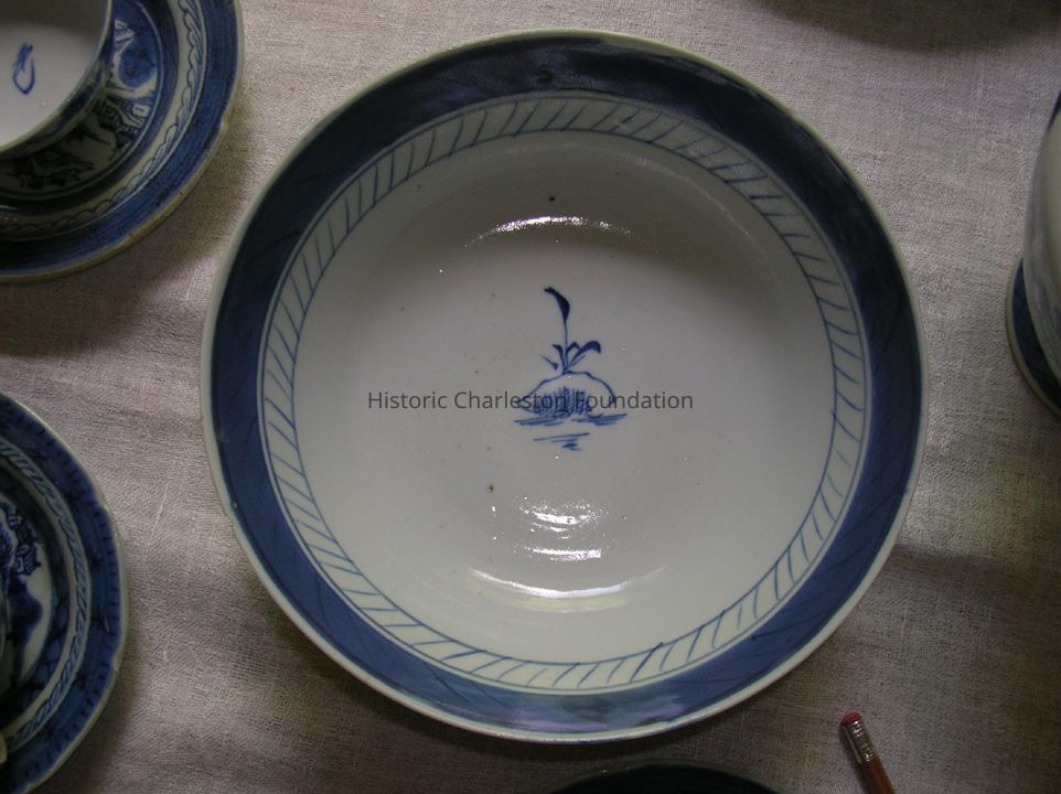 Straight line decoration, thin body, raised foot rim. Less intricate decoration on exterior including figure in temple. Perhaps Nanking, based on less careful decoration (further research needed).