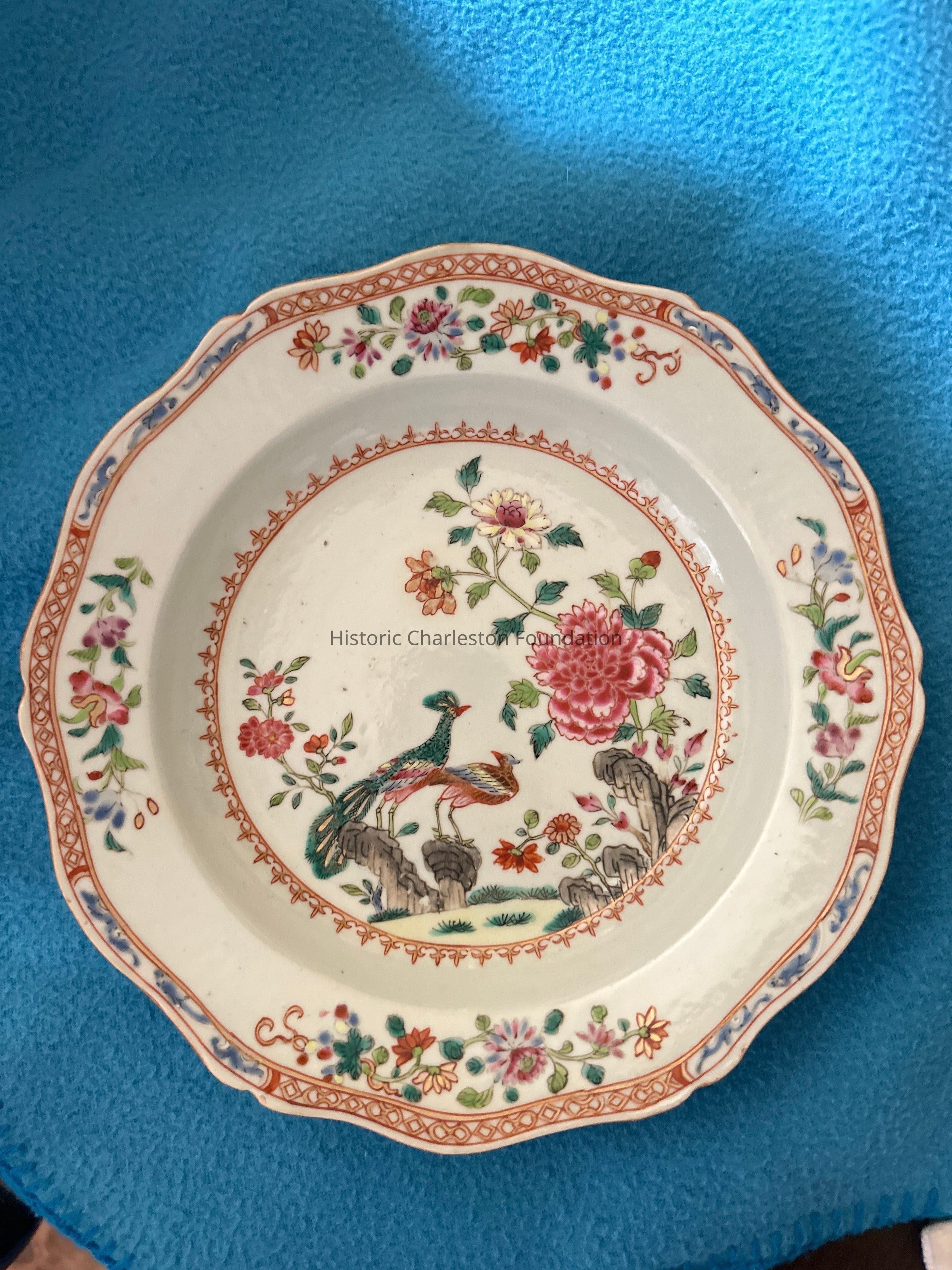 "Double Peacock and Peony" pattern. Chinese Export Porcelain. Part of a larger dinner service. Rim with chain border and floral garlands, central vignette of a pair of peacocks, pink peonies, and rocks surrounded by an inner spearhead border in iron red with gilt outline.