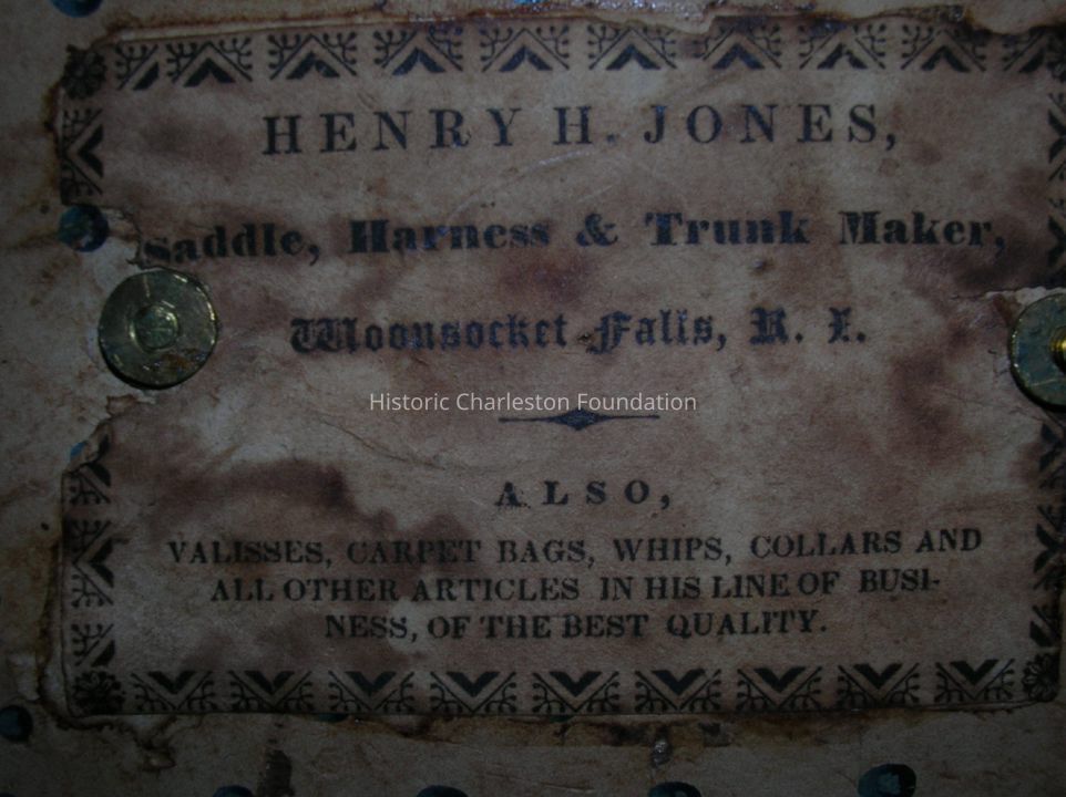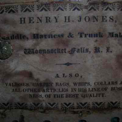 Henry H Jones/Saddle, Harness & Trunk Maker, Woonsocket Falls, R.I./ also, Valisses, Carpet Bags, Whips Collars and/All other Articles in His Line of Business, of the Best Quality.Notes