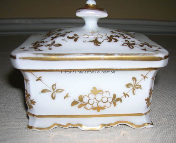 Covered box, white porcelain bombe-shaped body with gilt floral and leaf decoration, having fitted cover and canted corners, resting on shaped base, underside impressed with #165, scratched with initials 'BOD'Collection