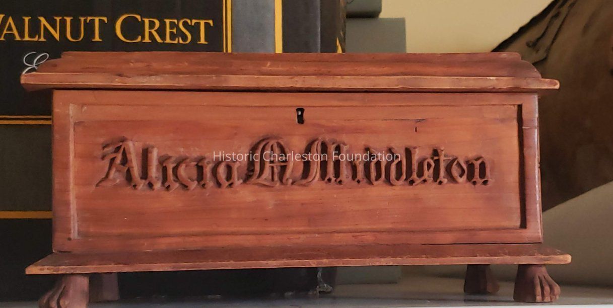Carved wooden box engraved with Alicia Middleton's name. Box was descended through Russell family and donated by Russell family descendent, Robert Christensen.Collection