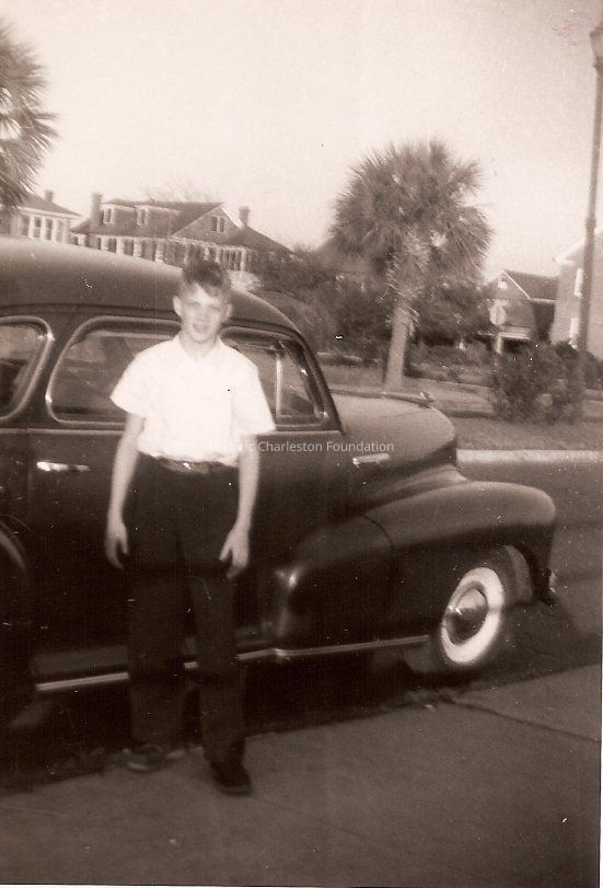 Photograph (scan) of a boy standing in front of a car. 139 South Battery in background.Collection