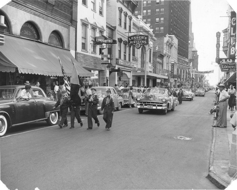 Boy Scouts and Cadillacs are on parade down the street. Onlookers on sidewalks.Collection