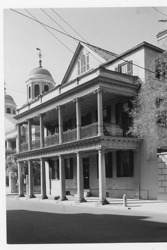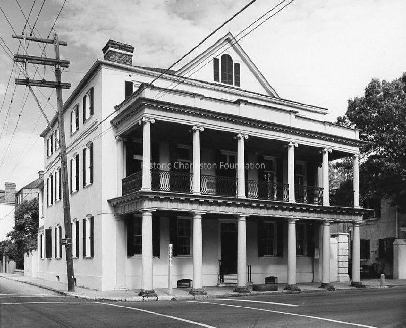 B&W photograph of the Branford-Horry House (59 Meeting Street), corner view from across the street, showing the east (front) and south elevations, showing the entire south elevation and the street corner (Meeting and Tradd Streets). "Bus Stop" sign installed on the corner of the sidewalk in front of the house.Collection