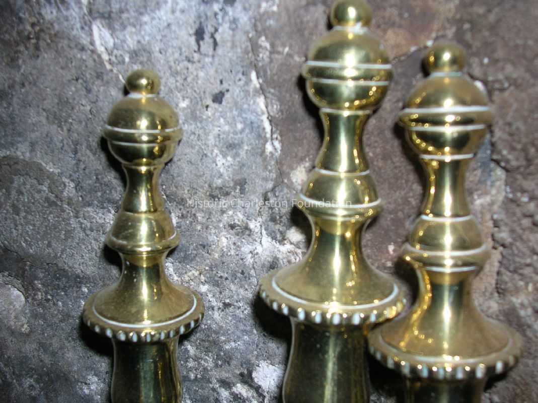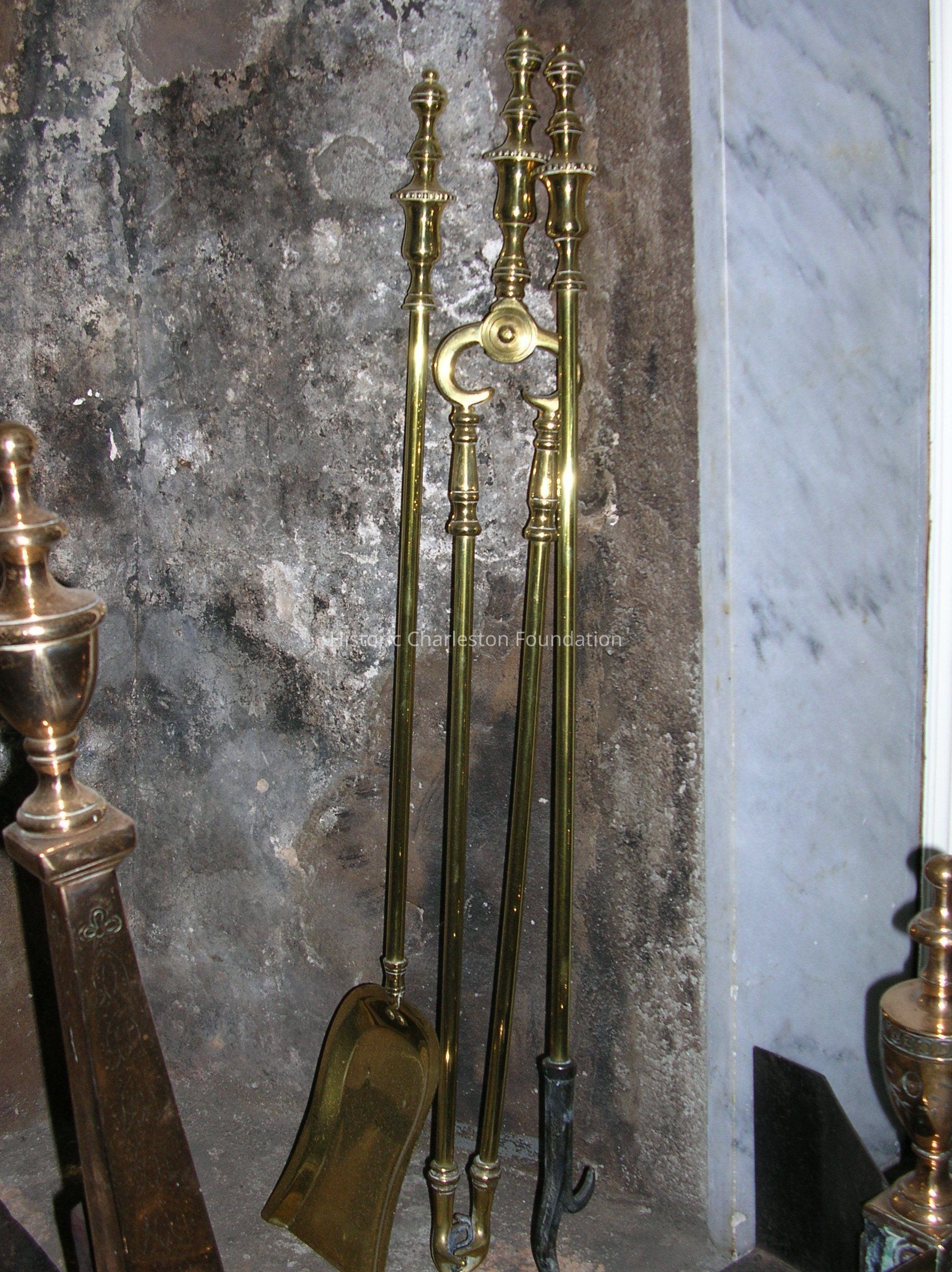 Pair of Brass Andirons with Ball and Claw Feet. Urns on Top. Three Piece Brass Fire Set Includes Shovel, Tongs and Poker. Tongs Have Claw Feet. Top Design of Fireset Matches AndironsCollection