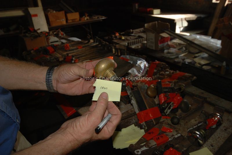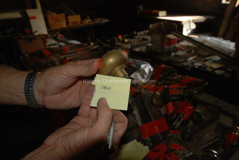 One stamped and cast brass doorknob from a group of four; larger than other three knobs.Collection