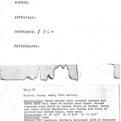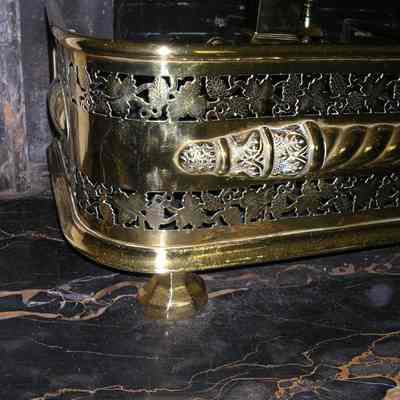 Brass fire fender with rounded corners and three half bun feet of hollow cast brass. Raised rope motif on center front, with leaves and vines running above and below. Iron interior tray.Collection