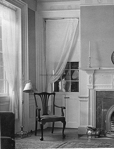 B&W photograph of a portion of the west wall of the second floor drawing room of the Brewton-Sawter House [77 Church Street], featuring the double-hung window with doors. Corner of the mantel is in view.Photograph Details