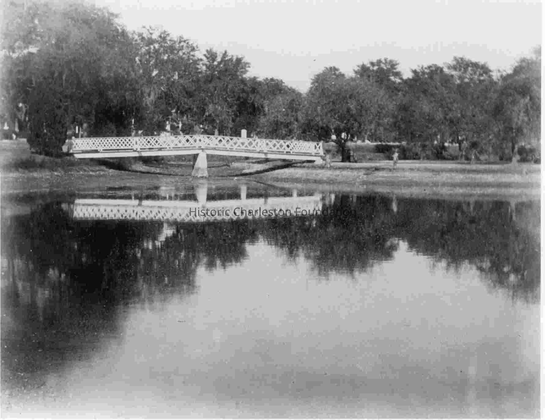 Footbridge at Magnolia Cemetery. Reflection pond in foreground.Collection