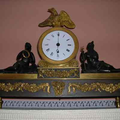 Bronze and Ormolu Mantel Clock, European, C.1800 with White Enamel Face and Roman Numerals with Three Dimensional Gilt Eagle on Top. Clock Face Surrounded By Ormolu Ring Iwth Fish Scall Decoration. Clock Is Flanked By Recumbent Figures in Bronze; on the Right a Male Figure with Gilt Trident and on the Left a Female with Gilt Wreath. Rectangular Bronze Base on Four Ormolu Feet. Front of Base with Ormolu Mask Flanked By Ormolu Swags of Flowers and Ribbons.Collection