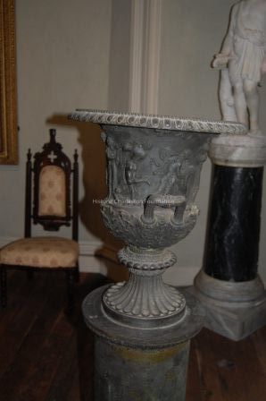 Patinated bronze urn on a matching patinated bronze pedestal. The scenes depict various figures related to the god Dionysus.Collection