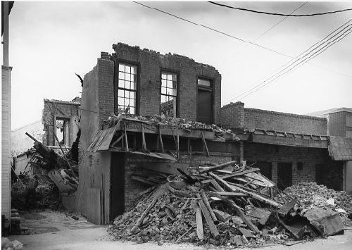 B&W photograph of the ruins of an unidentified building after Hurricane Hugo. Possibly on Market Street.Collection