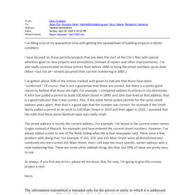 Building permits were required after January 10, 1882, but the City Archives doesn't have records before 1932. This spreadsheet collects all available references to building permits before 1932. First, and most importantly, newspapers listed permits with addresses and very brief descriptions. This list is comprehensive as to the Charleston News & Courier's articles; the Evening Post was checked mainly to fill gaps in the regular coverage by the News & Courier. Many microfilmed records were illegible (but when there is an overlap, trust the Evening Post as far more reabable). Those have question marks in whole or in part. House numbers have been updated to current numbering if possible, but the original entry is retained in description. Some names were owners; some were contractors. For new construction, lot numbers were often used from a plat instead of a street address. Second, some individual stories which referenced the start of building projects have been included, but no effort was made to find all such references. Third, Nick Butler located original permit materials, and this spreadsheet incorporates that material; Nick's work is a compilation available at the South Carolina Room of the Charleston County Library. Fourth, the South Carolina Historical Society has a commerical bulletin offered by the Bank of Charleston that printed basic information for all of the permits from Sept. 1895 through 1896; a copy appears as the first entry on the microfilmed building permits at the City Archives, but the information is not in the Archives' index. The Archives has permits and an index starting in 1932, but this spreadsheet had already gotten into the 1930s when I realized that, so it continues to 1936. Users should confirm these details by returning to the cited source. Lastly, if any new materials are located or errors found, let me know at KEberle@CharlestonLaw.edu.Created By