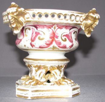 Each circular bowl on shaped base with paw feet, decorated with lavender scroll and gilt decoration. Tops are missing.Collection