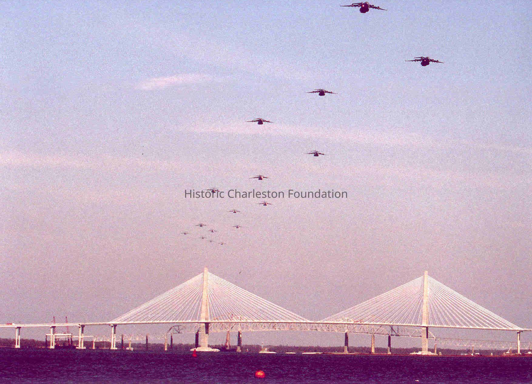View of the Arthur Ravenel Bridge with C-17 planes flying over it. Grace Memorial Bridge can be seen in the background. See 2006.015.4, C-17 aircraft carrier, for size reference.)Collection