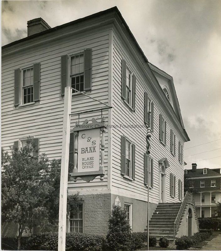 B&W photograph of the Blake-Grimke House (321 East Bay Street) when Citizen and Southern Bank was located there. Shows the view looking north at the south and east (front) elevations. Sign for "C&S Bank Blake House Office" in foreground. An American flag stands in front of the building. Partial view of the south elevation of 329 East Bay in background.Collection