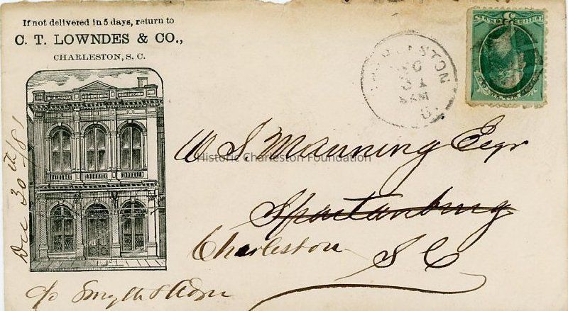 Addressed to W.S. Manning, Esq., Charleston, S.C., c/o Smythe & [illegible], dated Dec. 30, 1881. Three cent postage stamp affixed. Postmarked Dec. 31 on front. Stamped "Jan 3 6 a.m." and "Received December 31th" on back.