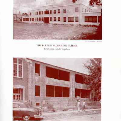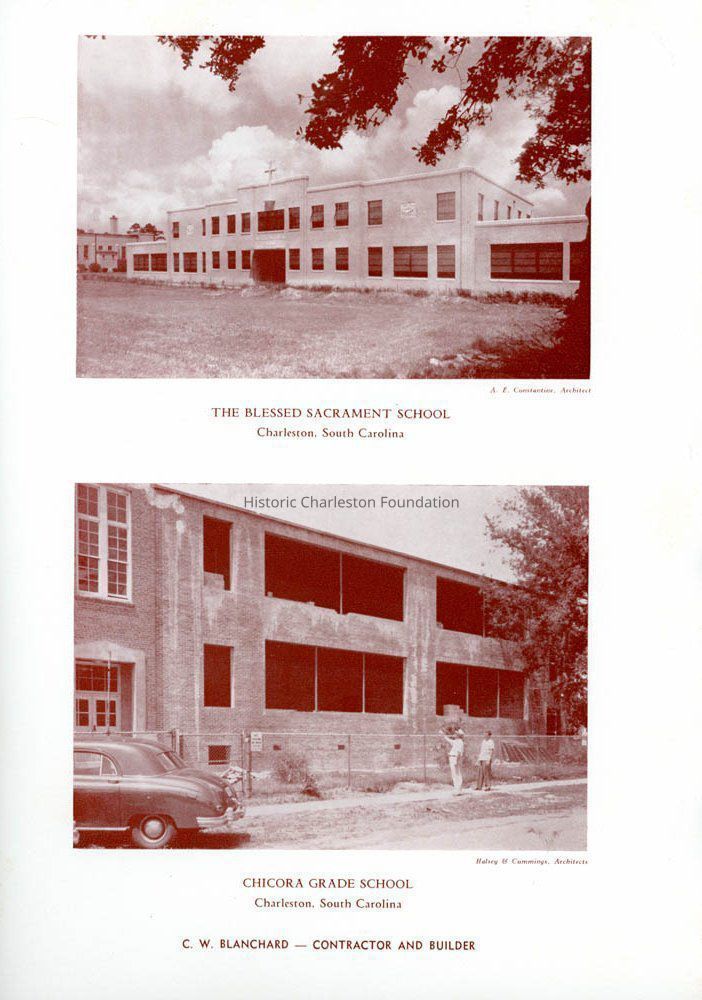 Page 3: Two photographs: "The Blessed Sacrament School, Charleston, South Carolina, A.E. Constantine, Architect" [7 St. Teresa Drive], and "Chicora Grade School, Charleston, South Carolina, Hasley & Cummings, Architects" [a/k/a Chicora Graded School] [Chicora Avenue/Spruill Avenue, North Charleston]