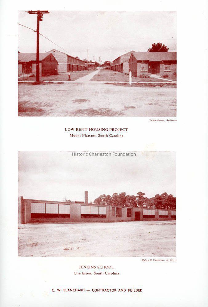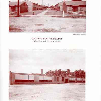 Page 5: Two photographs: "Low Rent Housing Project, Mount Pleasant, South Carolina, Tatum-Gaines, Architects" [located on what was formerly Greenwich Street between Bank and Ferry Streets**], and "Jenkins School, Charleston, South Carolina, Halsey & Cummings, Architects" [Daniel Jenkins Elementary School]