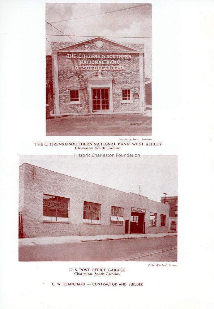 Page 2: Two photographs: "The Citizens & Southern National Bank, West Ashley, Charleston, South Carolina, Lane-Austin-Rogers, Architects" [17 Avondale Avenue], and "U.S. Post Office Garage, Charleston South Carolina, C.W. Blanchard, Designer" [25 Cumberland Street]