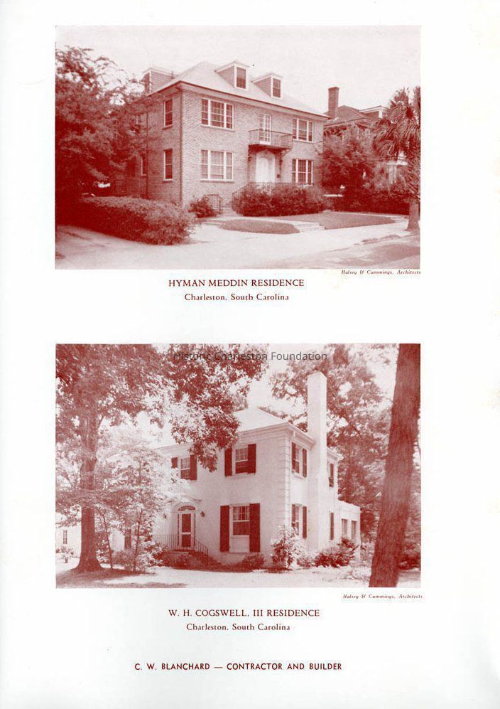 Page 4: Two photographs: "Hyman Meddin Residence, Charleston, South Carolina, Halsey & Cummings, Architects" [68 Murray Boulevard], and W.H. Cogswell III Residence, Charleston South Carolina, Halsey & Cummings, Architects" [7 Sale Road, The Crescent]