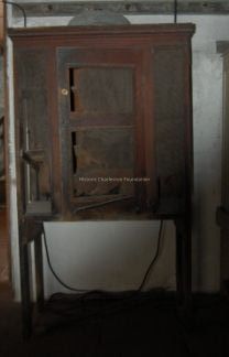 Having rectangular top over single cabinet mesh door, when open reveals three adjustable shelves, raised on straight legs, having mesh sides and mesh panels flanking cabinet door