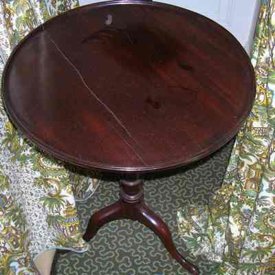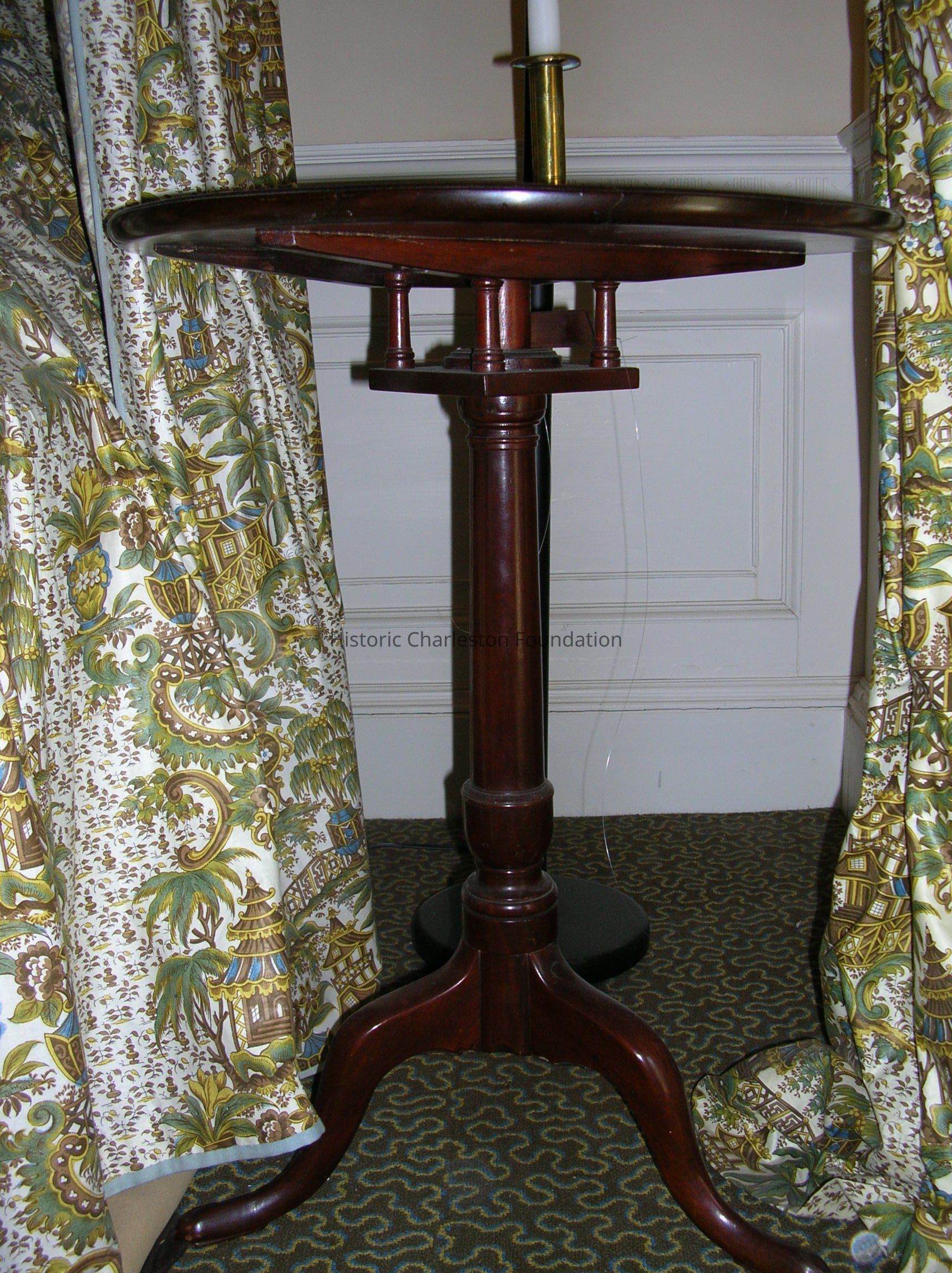 Tilt-top candlestand, mahogany, after the antique, having dish-dop over birdcage over turned standard, on three cabriole legs, on pad feet.Collection