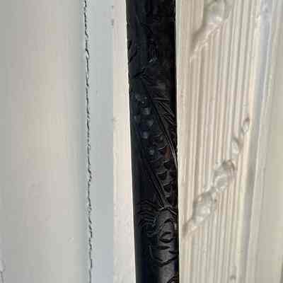 Carved ebony walking stick. Ebony shaft with a floral rose motif carving that spirals down. Tip of shaft is a rounded brass point, handle of cane detaches and from the shaft head is a pointed metal knife.Head of cane is carved with a square and crown, three carved bands. The cane handle is carved as the head/face of an Indian. This cane is separted in two pieces.Collection