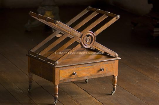 Canterbury made of mahogany of usual form, c. 1830, having turned and X-shaped supports with circular turned decoration at either end creating three divided areas for papers, on molded base, above single drawer with two knob handles, on short turned legs, on castersCollection