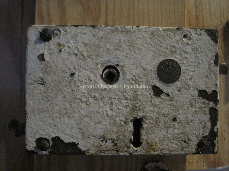 Carpenter's lock; still useable. Wrought iron with brass patent seal. Came from 64 Warren Street.Collection