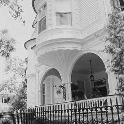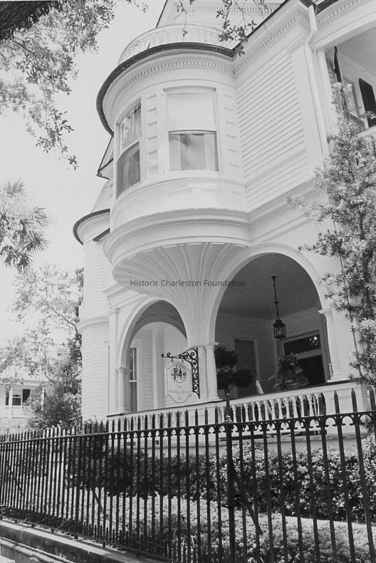 Three B&W photographs of the Carrington-Carr House (2 meeting Street) featuring the bay window and arched piazza. Iron gate in foreground.Collection