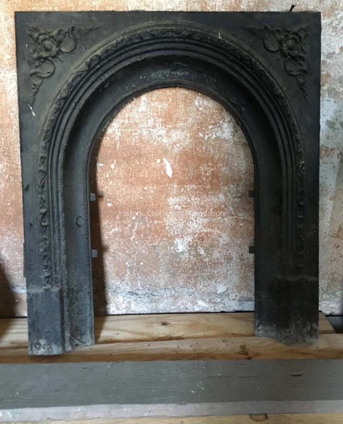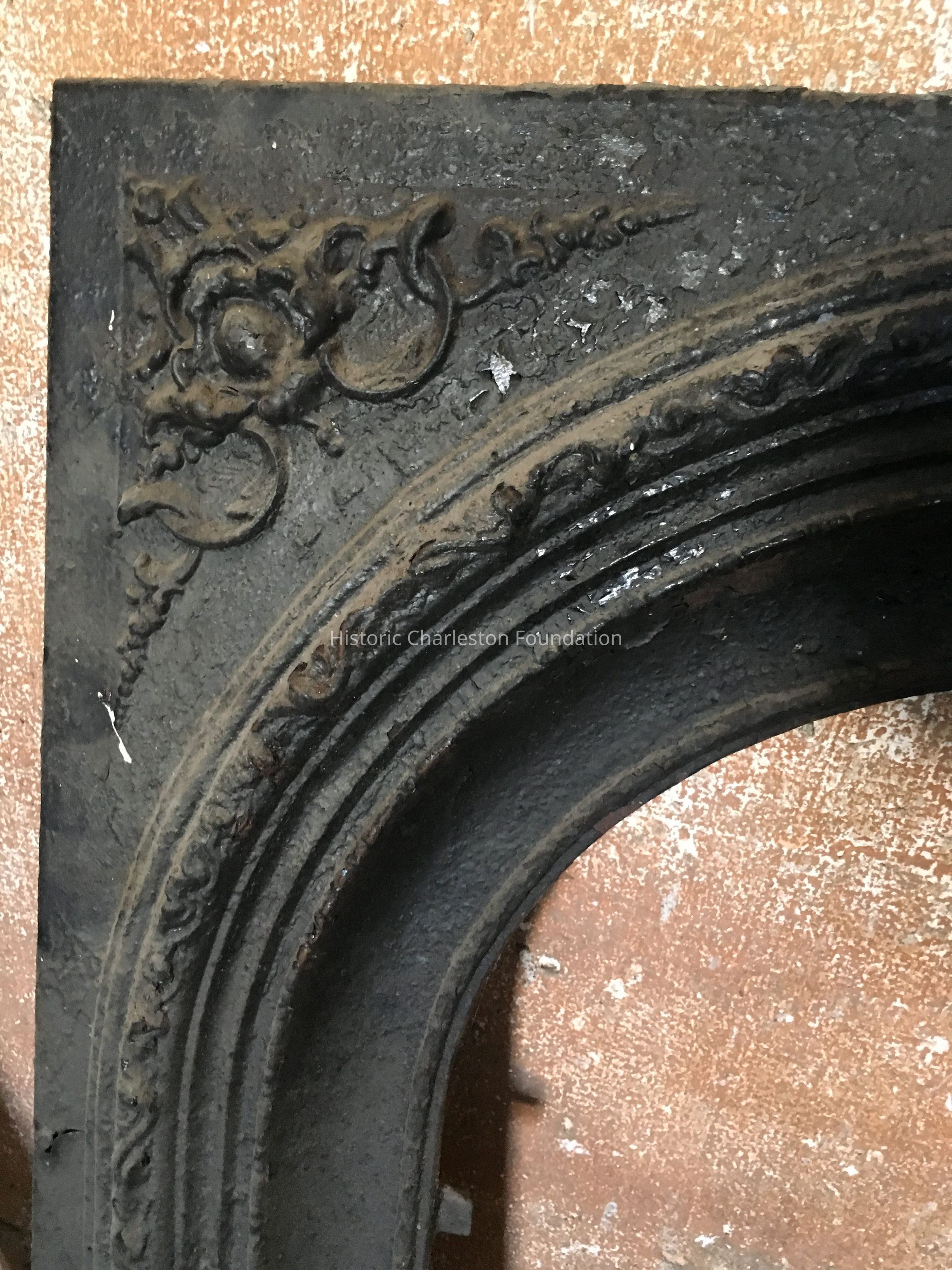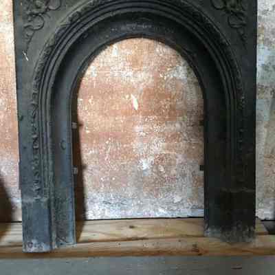 Cast iron fire sorround. Square frame and currved inner surround. Floral detailing. Chipping; has white paint splatter.Collection