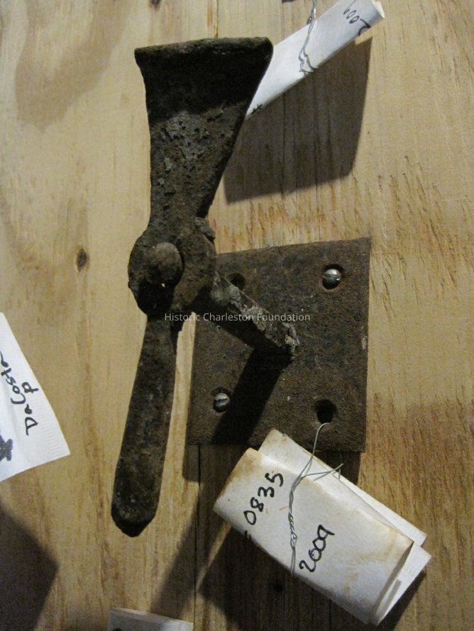 One of three hand-wrought "rat tail" shutter dogs with with screw plates.Collection