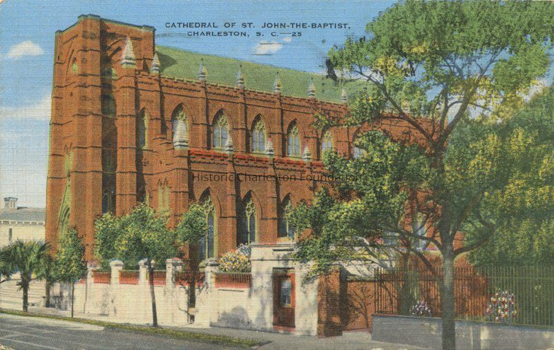 Postcard featuring the Cathedral of St. John the Baptist (122 Broad Street), street elevation, southeast corner of building.